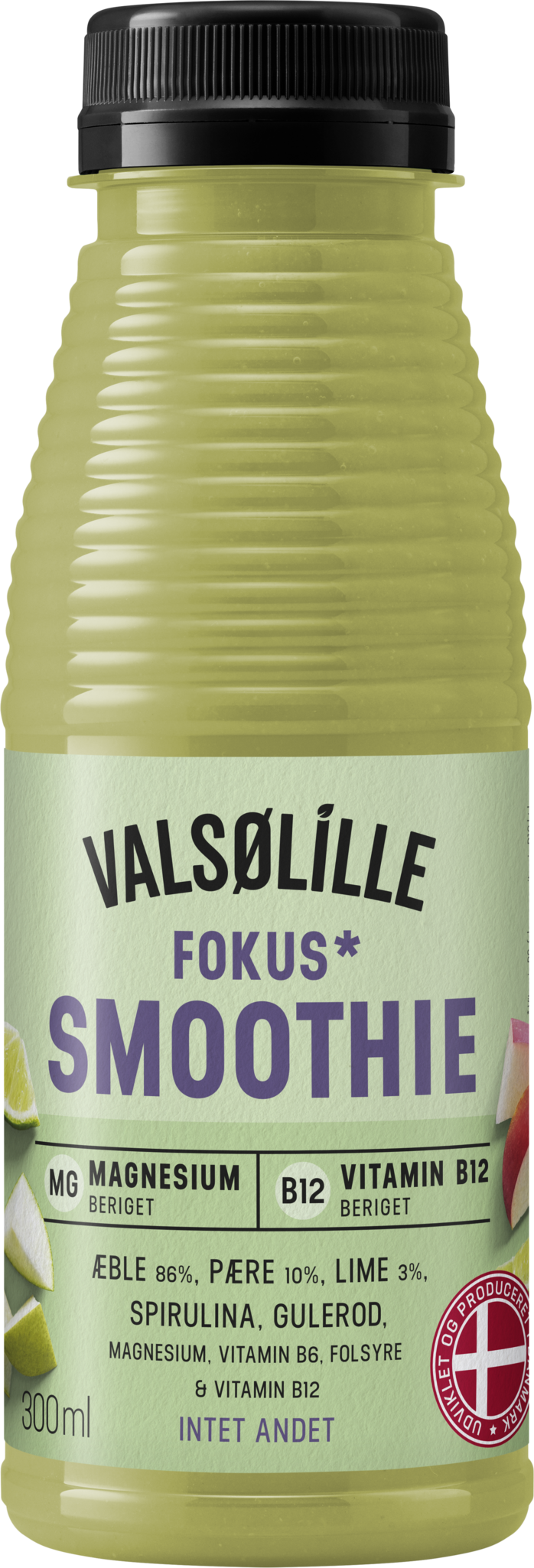 I Valsølille fokus smoothie er der ekstra af alt det som kroppen har brug for! Udover alt det gode fra frugt og grønt har den fået et ekstra tilskud af vitamin B6, folsyre og vitamin B12 som bidrager til immunsystemets normale funktion. Samt magnesium der hjælper med at mindske træthed og udmattelse. Nyd den som en del af en sund livsstil samt en varieret og afbalanceret kost, perfekt til når du er på farten.