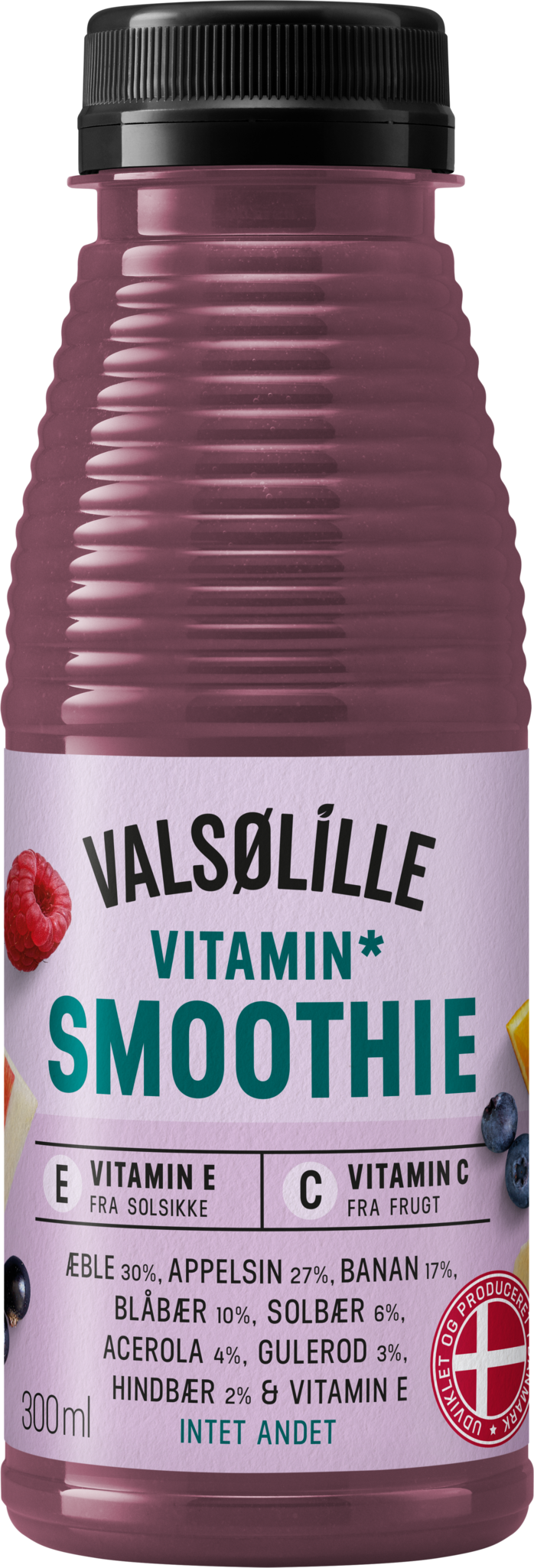 Valsølille vitamin smoothie er en forfriskende blanding af blåbær, hindbær og solbær. Takket være bananer får den en cremet konsistens. Derudover indeholder den ekstra E-vitamin fra solsikker og C-vitamin fra bærret acerola. Et godt supplement til en varieret og afbalanceret kost, der bidrager til at beskytte cellerne mod oxidativt stress. Perfekt til farten når den lille sult melder sig.